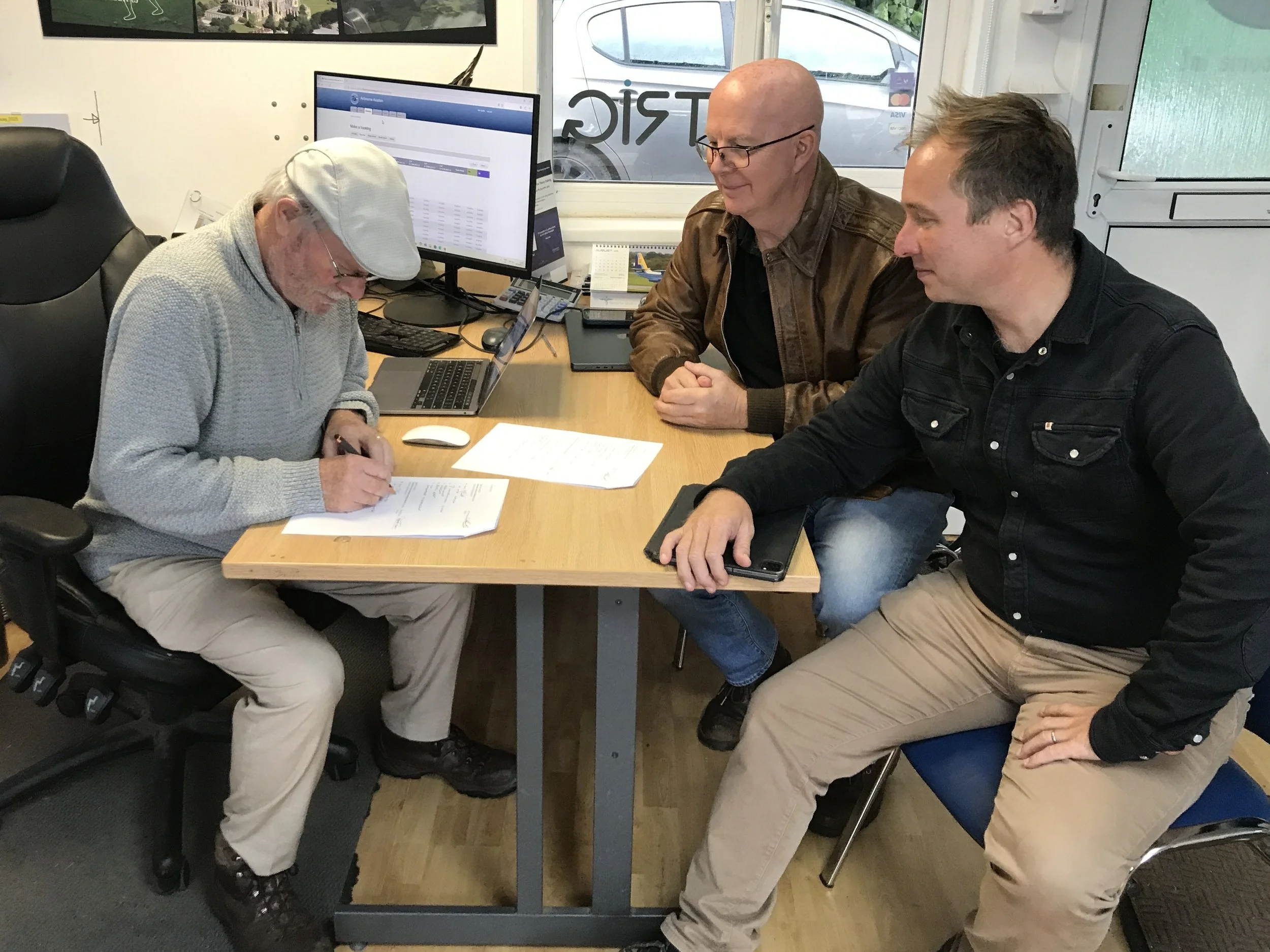 A historic moment captured: Airbourne founder Mac Smith witnesses the contract, signed by Cliff Hawkins and new owner Patrick Tame.
